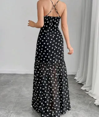 Elegante abito lungo con stampa a pois. - Scollo a V con dettaglio intrecciato. - Spalline sottili. - Tessuto leggero e fluttuante.