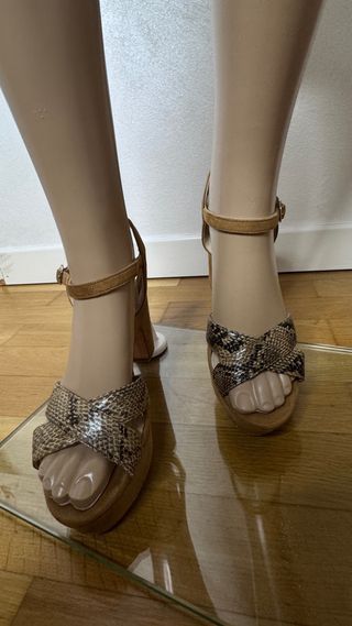 Sandali con zeppa Bata, un modello elegante e versatile. - Tomaia in fantasia pitonata. - Cinturino alla caviglia in camoscio. - Zeppa in sughero.
