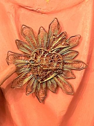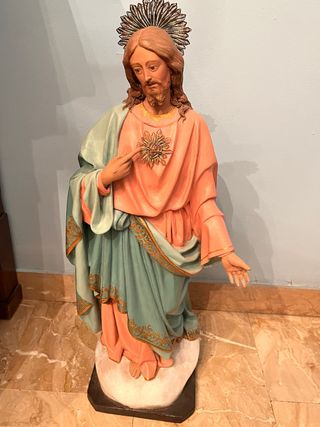 Antica statua del Sacro Cuore di Gesù, realizzata in cartapesta e filigrana. Un pezzo unico con dettagli curati. - Materiali: cartapesta e filigrana. - Raffigurazione del Sacro Cuore di Gesù. - Aura decorata con filigrana d’argentoe oro ,cuore in filigrana d’argento e oro . Fine del 1800 , abito drappeggiato e colori stupendi . Sacro cuoete corona di filigrana oro e argento di Campo Ligure. Ritiro a mano , non spedisco ,con un corriere non mi fido.