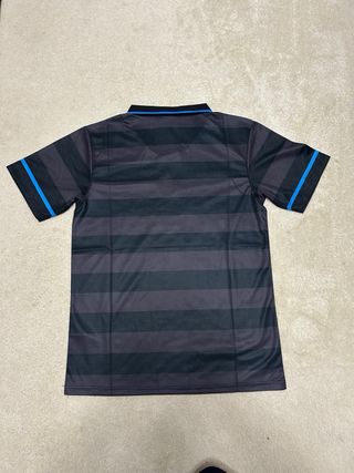 Maglia da calcio vintage dell'Inter, marca UMBRO, sponsor PIRELLI. Design a righe verticali. - Colore principale grigio scuro/nero. - Dettagli blu sulle maniche. - Logo UMBRO sul petto. - Stemma dell'Inter sul petto. - Sponsor PIRELLI giallo. - Fantasia tono su tono sul davanti.