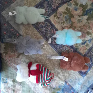 Set di 5 peluche Lafufu. - Peluche verde imitazione di Ququ ( ottime condizioni) - Peluche grigio imitazione Eheh ( ottime condizioni) - Peluche verde chiaro imitazioni di Ququ versione più piccolina ( ottime condizioni) - Peluche marrone imitazione Secret DuoDuo ( ottime condizioni) - Peluche bianco con cappello natalizio e Coca-Cola ( buone vomdizioni : etichetta tagliata e fo do lattina ricreato da me) .