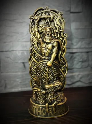 Realizzato e pitturato a mano. Pezzi unici Misure descritte in foto. Materiale: Gesso Alabastrino Colore oro / dorato, finitura metallica, effetto pietra. Scultura mito norreno Thor, divinità della mitologia vichinga, figlio di Odino. Dettagli intricati in rilievo con simboli iconici, mantello leggendario mjölnir. Figura mitologica dio nordic rune, lancia gungnir e scudo, re del tuono e del fulmine. Simbolo protettore nordico vichingo mitologico. Disponibile anche Odino, Freya e altre statue nordiche. Particolare decoro casa statuetta vichingo stile gotico celtico pagan esoterico Soprammobile statua gothic punk con segni vikingo