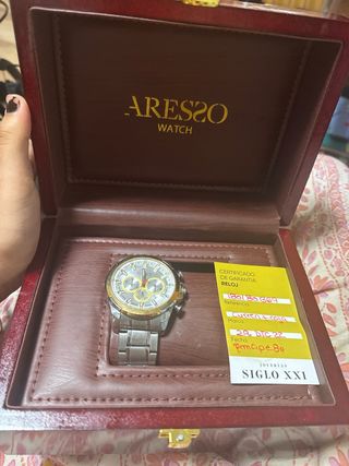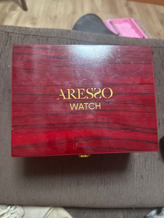 Scatola elegante per orologio della marca Aresso. Design con finitura in legno color rosso. Dettaglio dorato nel chiusura. Si accettano offerte.