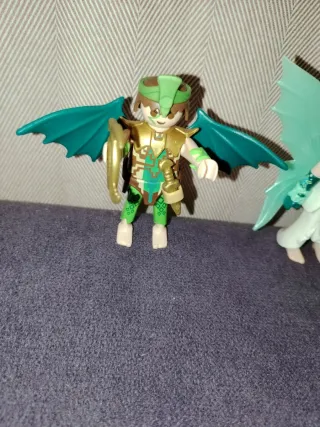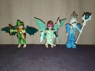 Set di tre figure Playmobil a tema fantasy. - Figura di guerriero con armatura dorata e ali di drago. - Figura di fata con vestito verde e ali traslucide. - Figura di re di ghiaccio con corona e scettro.