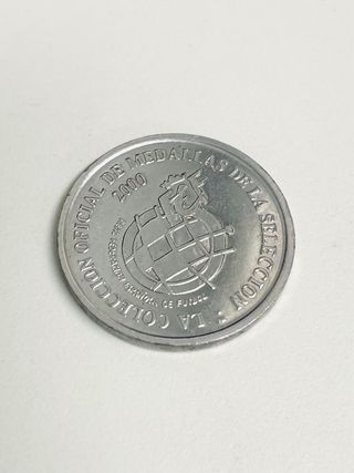 Moneda commemorativa di calcio con l'immagine di Mendieta. Moneda da collezione calcio 2000 MENDIETA LA COLLEZIONE UFFICIALE DI MEDAGLIE DELLA SQUADRA SPAGNOLA - Design di Mendieta Centro Campista. Dettaglio di giocatori di calcio sul retro.