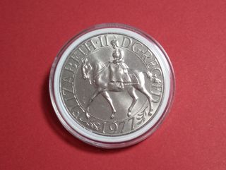 VENDO: LOTE Nº 65. Moneta commemorativa del 25° anniversario dell'ascesa al trono della Regina Elisabetta II. ANVERSO: Regina Elisabetta II a cavallo a sinistra, legenda intorno, data sotto. REVERSO: Corona di Edoardo, decorazione floreale. DESIGNER: Arnold Machin. Iscrizione: ELIZABETH II D.G.REG.F.D. IN OTTIMO STATO DI CONSERVAZIONE, INCAPPUCCIATA E IN SACCHETTO DI PLASTICA PER EVITARE GRAFFI. (OFFRO LOTTI PER SPEDIZIONI PIÙ ECONOMICHE)