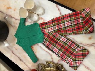 Set originale per Nancy. - Maglione verde con la lettera 'N' rossa. - Pantaloni a quadri scozzesi in rosso, verde e giallo. - Stivali bianchi.