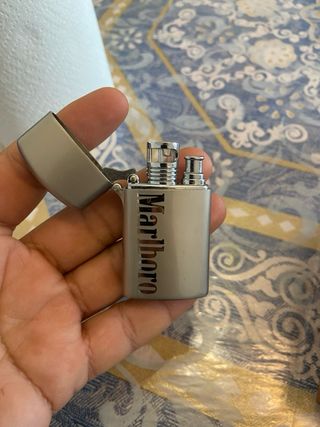 Astuccio da collezione con tre accendini della marca Marlboro e una custodia. - Tre accendini con design diversi. - Include una custodia in pelle. - Presentato in una scatola con design in legno.