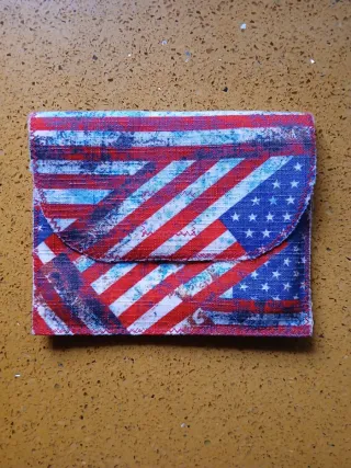 Borsa tabaquera in tessuto cucita a mano con chiusura in velcro. Design con la bandiera americana. Nuova. Tre accendini nuovi con gas. Tutto per 5€. SPEDIZIONE IN 24H.