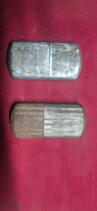 Due vecchi accendini con incisioni decorative. Da restaurare. Design inciso con motivi geometrici e circolari. Stile dei primi del XX secolo.