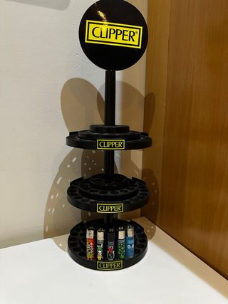 Espositore da tavolo per accendini della marca Clipper, con custodia. Design moderno e funzionale.