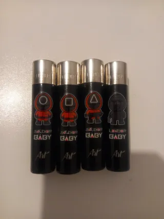 Confezione da 4 accendini Clipper con design ispirato a Il Gioco dell'Acchiappasorci. Sono nuovi e originali. - Design Soldier Baby con cerchio, quadrato e triangolo. - Design Leader Baby con maschera. Marca Clipper.