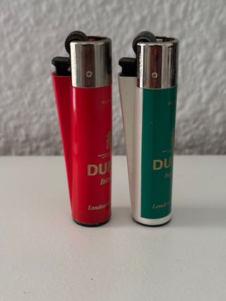 Lote de dos encendedores Clipper con diseño Dunhill. - Encendedor rojo con texto Filter de Luxe. - Encendedor verde con texto Superior Mild. - Marca: Clipper. - Diseño: Dunhill International.