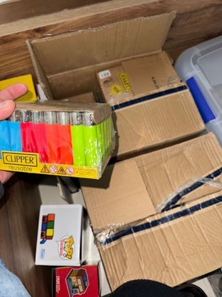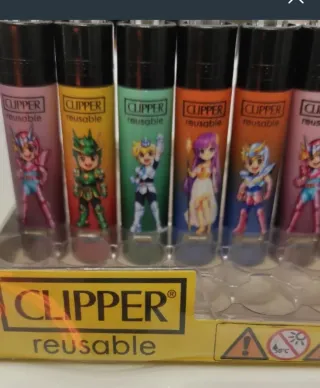 Confezione da 10 accendini della marca Clipper con diversi design. - Accendino blu con testo gas blu CLIPPER. - Accendino bianco con logo M. - Accendino rosso con logo Caixa Sabadell. - Accendino bianco con disegno di Cobi e cerchi olimpici. - Accendino giallo con logo John Player Special. - Accendino nero con 777. - Accendino bianco con disegno di un gelato. - Accendino arancione con simbolo Om. - Accendino giallo con simbolo Om. - Accendino verde con disegno di spiaggia e ombrellone.