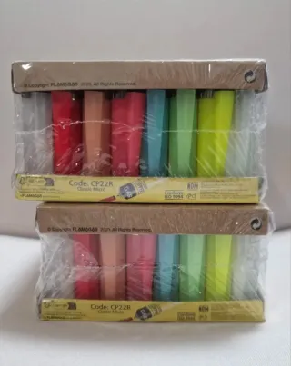 Confezione di accendini Clipper riutilizzabili in vari colori vivaci. Vengono forniti nella loro confezione originale. Include anche 10 micce antivento (non accendini). - Accendini in plastica e metallo. - Design ergonomico. - Ricaricabili e con pietra sostituibile.