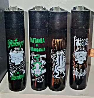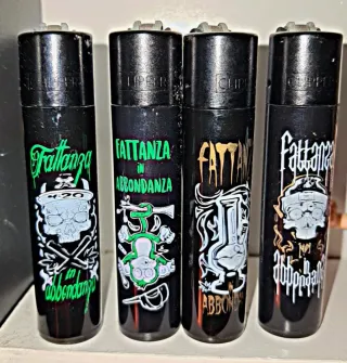 Set di 4 accendini Clipper con la grafica Fattanza in Abbondanza. Nuovi mai usati. - Grafica Fattanza in Abbondanza su tutti e 4 gli accendini. - Design raro e ricercato.