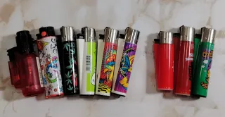 Confezione da 9 accendini della marca Clipper con design vari e colorati. I 3 sulla destra devono cambiare la pietra, il resto funziona perfettamente.