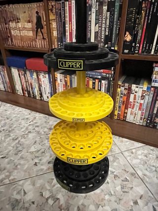Espositore con base girevole, colore giallo per accendini Clipper. Ha 4 livelli con molteplici scomparti. Colore: Giallo. Marca: Clipper. Materiale: Plastica.