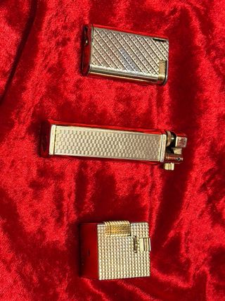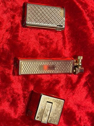 Set di tre accendini in stile vintage. - Un accendino dorato con design ondulato. - Un accendino argentato con linee verticali. - Un accendino dorato con dettagli nella parte superiore. - Accendino dorato con custodia 30€ - Accendino dorato a pipa 20€ (manca il coperchio inferiore) - Accendino argentato a pipa 25€ Tutti gli accendini richiedono pietra e manutenzione.