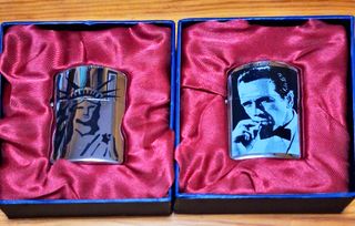 Due accendini tipo Zippo con design da collezione. - Design della Statua della Libertà. - Design di un uomo che fuma con farfallino. - Presentati nelle loro confezioni originali con fodera di velluto rosso.