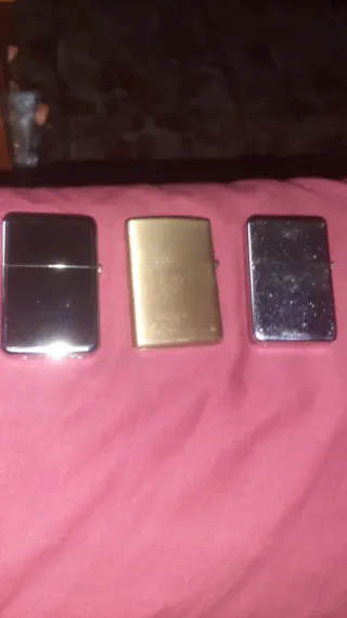 Tre accendini tipo Zippo a 12€ insieme o 5€ ciascuno. - Uno nero con trifogli. - Uno dorato con design egiziano. - Uno argentato liscio.