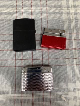 Set di tre accendini antichi. - Accendino nero stile Zippo. - Accendino rosso metallico. - Accendino argentato con design testurizzato.
