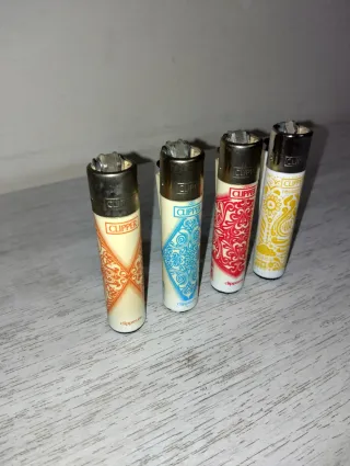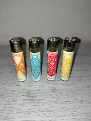 Set di 4 accendini Clipper con fantasie assortite. - Accendini Clipper riutilizzabili. - Design con motivi decorativi. - Colori: arancione, azzurro, rosso, giallo. Usati quindi vuoti, ideali per collezioni Tre sono leggermente ingialliti SET PERSONALIZZABILE! Se preferisci, scegli accendini da un altro mio annuncio e a seconda della disponibilità crea il tuo set su misura:contattami per concordare prezzo e spedizione