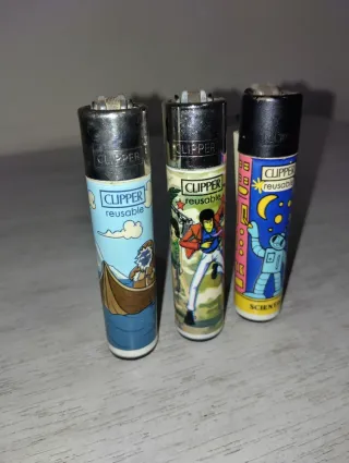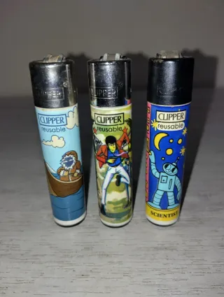 Tre accendini Clipper riutilizzabili con diverse grafiche. - Accendino con personaggio in barca. - Accendino con personaggio in movimento Lupin. - Accendino con astronauta e luna. Usati quindi vuoti, ideali per collezioni SET PERSONALIZZABILE! Se preferisci, scegli accendini da un altro mio annuncio e a seconda della disponibilità crea il tuo set su misura:contattami per concordare prezzo e spedizione