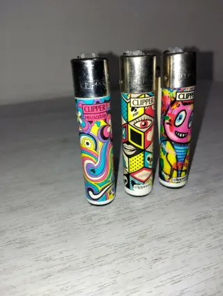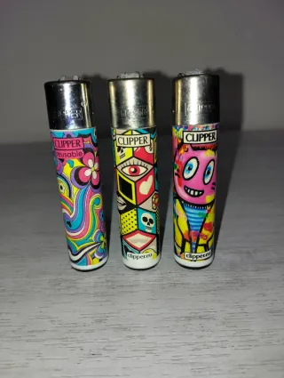 Set di tre accendini Clipper con fantasie vivaci e colorate. - Design psychedelic flowers. - Design pop art eye skull. - Design monster face. - Riutilizzabili. Usati quindi vuoti, ideali per collezioni SET PERSONALIZZABILE! Se preferisci, scegli accendini da un altro mio annuncio e a seconda della disponibilità crea il tuo set su misura:contattami per concordare prezzo e spedizione