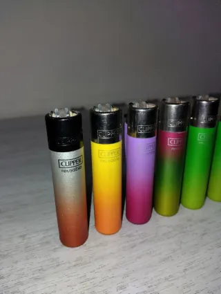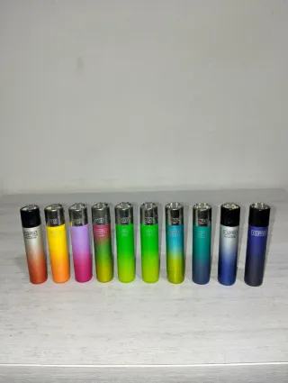 Set di 10 accendini Clipper con design sfumato. - Design sfumato colorato. - Accendini ricaricabili. - Marca: Clipper. Usati quindi vuoti, ideali per collezione SET PERSONALIZZABILE! Se preferisci, scegli accendini da un altro mio annuncio e a seconda della disponibilità crea il tuo set su misura:contattami per concordare prezzo e spedizione