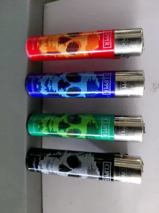 Set di 4 accendini Clipper con design a teschio. - Design a teschio stilizzato. - Colori assortiti: nero, rosso, verde, blu. - Marca Clipper.