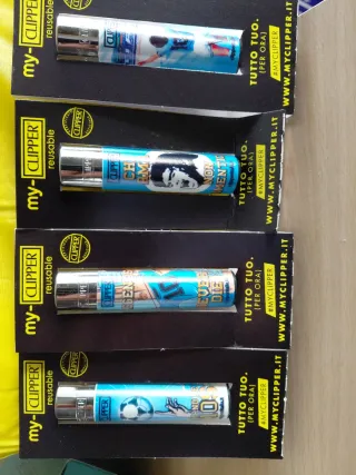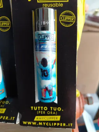 Collezione di accendini Clipper con design dedicati a Diego Armando Maradona. - Design Chi ama non dimentica. - Design 10 Leggende. - Design 100 Anni. - Design Tutto tuo. - Accendini riutilizzabili.