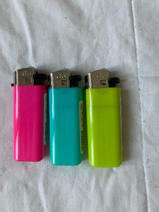 Set di tre accendini di piccole dimensioni in colori vivaci. - Accendino rosa - Accendino turchese - Accendino verde lime