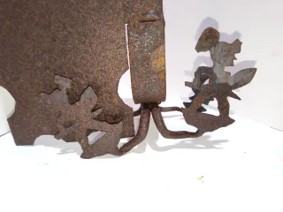 Un antico pezzo in ferro battuto, proveniente da un carretto siciliano originale. - Materiale: Ferro battuto. - Si può anche appendere. - Pezzo unico. - Misura cm 17x10x10. Vendesi come da foto Antica parte di pedaliera interamente realizzata a mano da antichi fabbri artigiani siciliani