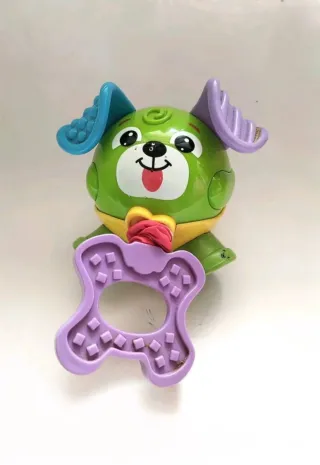 Giocattolo vintage a forma di cagnolino Fisher Price. - Colore verde brillante. - Orecchie blu e viola. - Dettagli del viso con lingua rossa. - Include un sonaglio viola a forma di osso. - Tirando la maniglia il giocattolo vibra - centimetri 15 - perfettamente funzionante