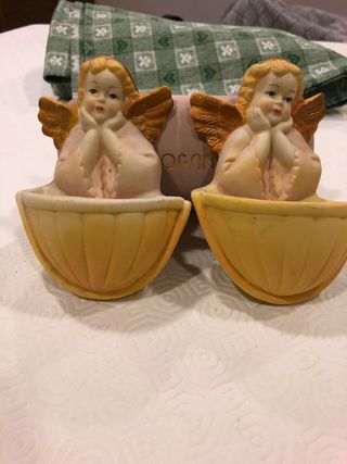 Coppia di acquasantiere anni 60/70, buone condizioni, sono in plastica ma le figure sono in metallo, lunghezza 15cm