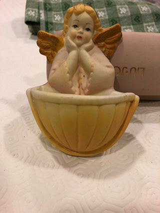 Coppia di acquasantiere in ceramica dipinte a ma 9 raffiguranti l'angelo di Raffaello. Ideali come regalo di natale o come regalo per altre ricorrenze o per collezionisti di acquasantiere.