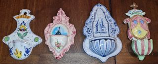 Bellissime acquasantiere in ceramica dipinte a mano. Sono ideali per arredare uno spazio dallo stile rustico o vintage. - Sei pezzi in totale. - Motivi religiosi. - Colori vivaci e dettagli delicati. - Perfetto stato di conservazione. I grandi 60€ e i piccoli 50 ciascuno prezzo fisso 200€