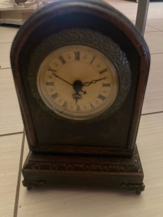 Elegante orologio da tavolo con cassa in legno scuro e quadrante con numeri romani. - Design classico. - Dettagli decorativi sulla cornice. - Base stabile con piedini. - Finitura anticata.