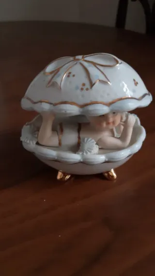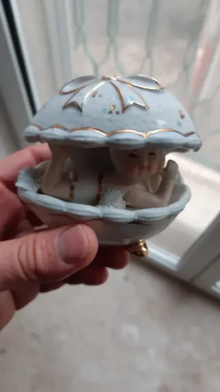 Deliziosa statuetta vintage in porcellana raffigurante un neonato all'interno di un uovo. - Dettagli in oro e azzurro. - Base con piedini dorati. - Finitura lucida.