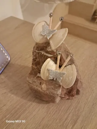 Originale decorazione artigianale composta da una pietra naturale e conchiglie. - Decorazione a forma di farfalla. - Dettagli glitterati. - Elementi marini.