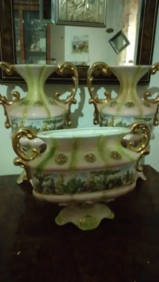 Bellissimo trittico antico in ceramica/ o porcellana finemente dipinta a mano con scene campestri e dettagli dorati. No InPost Locker Point. Veramente particolare degli anni 50. Visto l'età presenta qualche imperfezione. Un oggetto veramente particolare, raro. - Non spedisco con InPost Locker Point. - Tre pezzi coordinati. - Decorazioni floreali e paesaggistiche. - Manici dorati,un po' sbiadite. - Base decorata.