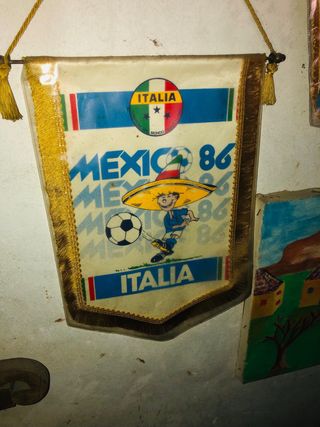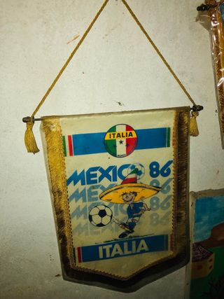 Gagliardetto commemorativo dei Mondiali di calcio Messico 1986. - Raffigura la squadra italiana. - Dettagli con i colori nazionali. - Decorazione a tema calcistico. misure cm 20 x 15