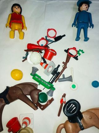 Lotto di Playmobil degli anni '80 con cavalli e personaggi. - Due cavalli marroni con selle. - Un personaggio in blu con cappello. - Un personaggio in giallo e rosso. - Un personaggio in rosso. - Un personaggio in verde. - Accessori vari come secchi, coni, armi e altri piccoli pezzi. serie lavori in corso e cow boy