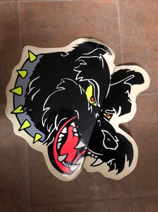 Set di adesivi vintage raffiguranti la testa di un cane aggressivo. - Design con contorni bianchi. - Dettagli in giallo e rosso. - Collare con borchie. cm 30 x 30 9,99