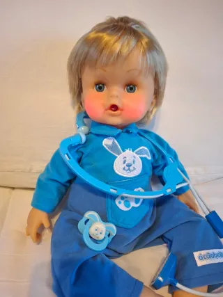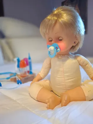 Bambola Cicciobello Bua, perfetta per i più piccoli. Funzionante 3biberon 1stetoscopio 1siringa 1termometro İ biberon hanno perso l'adesivo - Bambola con ciuccio. - Vestitino beige. - Capelli biondi.
