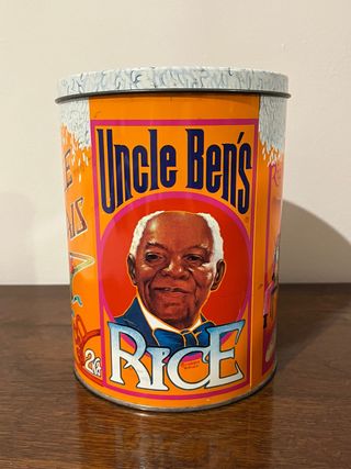 Scatola di latta vintage Uncle Ben's, risalente agli anni '60. Un pezzo da collezione con un design iconico. - Scatola di latta rotonda. - Grafica colorata con il volto di Uncle Ben. - Ideale per collezionisti o come elemento decorativo.