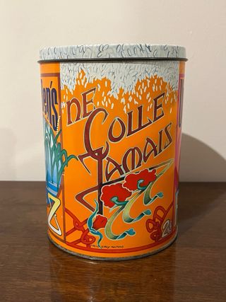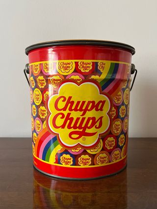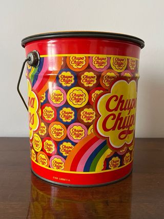 Iconico secchiello in latta della Chupa Chups. Articolo vintage, risalente agli anni 90 circa. Made in Spagna. Completo di coperchio originale in metallo e manico in metallo. 21 cm altezza x 19 cm circa di diametro. Condizioni: pur trattandosi di un articolo vintage ed utilizzato si presenta in ottime condizioni generali. Presenti sulla superficie alcuni segni di utilizzo, parti metalliche della maniglia con ossidature del tempo e interno come da foto. Nel complesso, comunque, le condizioni generali sono ottime. #chupachups #vintagechupachups #chupachupsvintage #scatolalatta #scatolalattavin