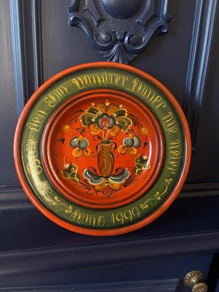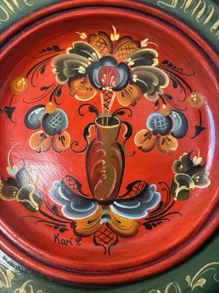 Piatto decorativo in stile rosemaling norvegese, firmato dall'artista Kari Petterse. - Decorazione floreale centrale su sfondo rosso. - Bordatura verde con scritte dorate. - Anno 1999 inciso.
