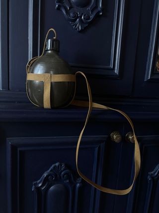 Borraccia vintage in stile militare, ideale per collezionisti o per un tocco retrò. - Colore verde militare. - Dotata di cinghia per il trasporto. - Tappo a vite nero.